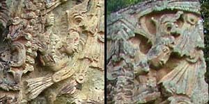 The stela's rear (east) side represents the maize god's backrack, and contains complicated imagery representing the central axis of the world and insignia for the cosmic levels that the world tree unites.