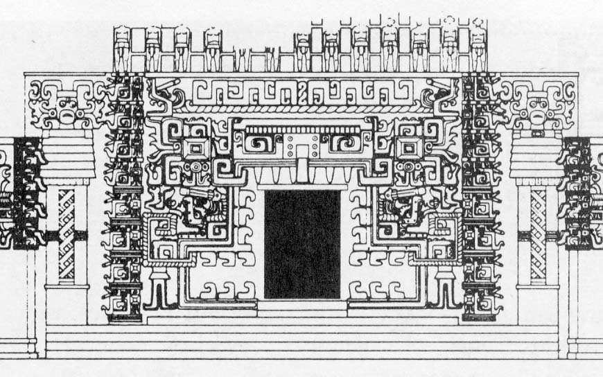 Above the wide upper mask the bodies of two serpents intertwine (a frequent motif on this kind of entrance). And in continuation of the façade there are the remains of a “soaring” comb, with profuse openwork, whose decoration consists of a row of large standing human figures.